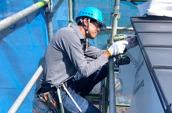 求人サイトで植田板金店を見つけました。建築板金という仕事は知らなかったのですが、ホームページを見て主に屋根・外壁・樋工事等の施工業者ということが分かり、元々“モノづくり”に興味があったこと、未経験での受け入れも可能なこと、そして日曜が休みで夜も特別遅くないということから応募しました。